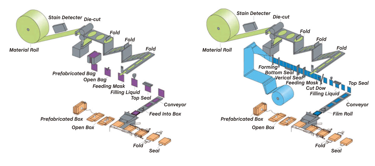 VPD400全自動面膜包裝機(在線裝袋) 滿足醫(yī)藥級GMP生產(chǎn)設(shè)備要求,只需卷膜進料即可完成切膜成型、面膜折疊、在線制袋(或預制袋)、面膜入袋、添加液體、熱封成袋等步驟,末端產(chǎn)出成品。